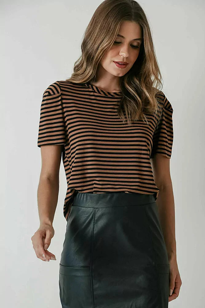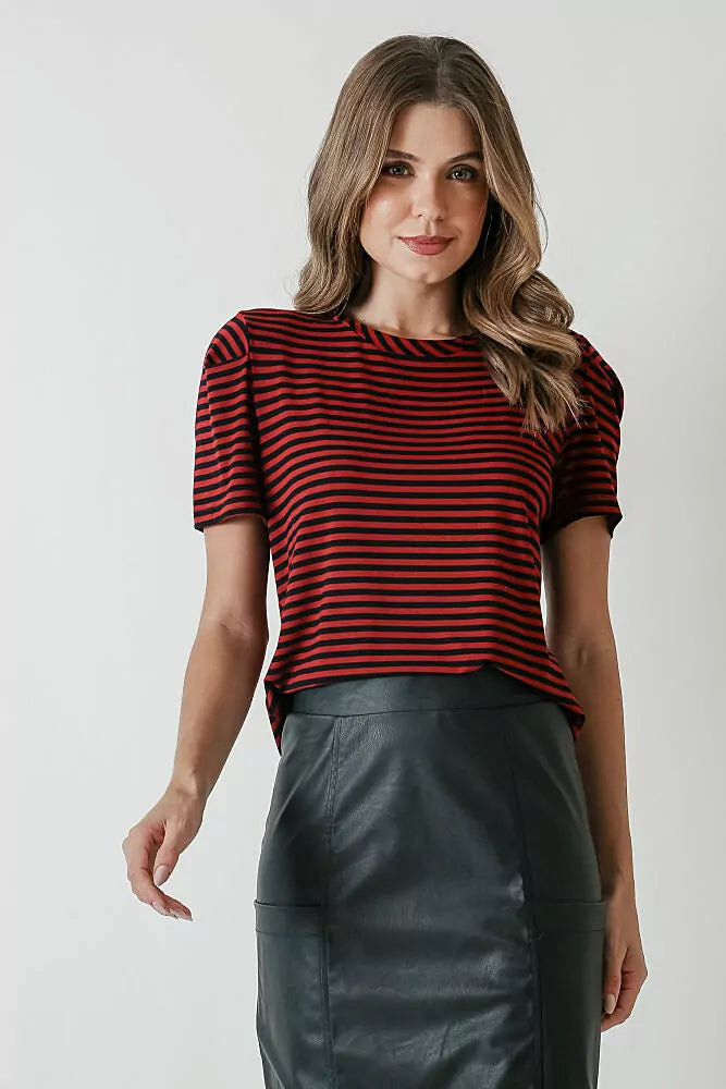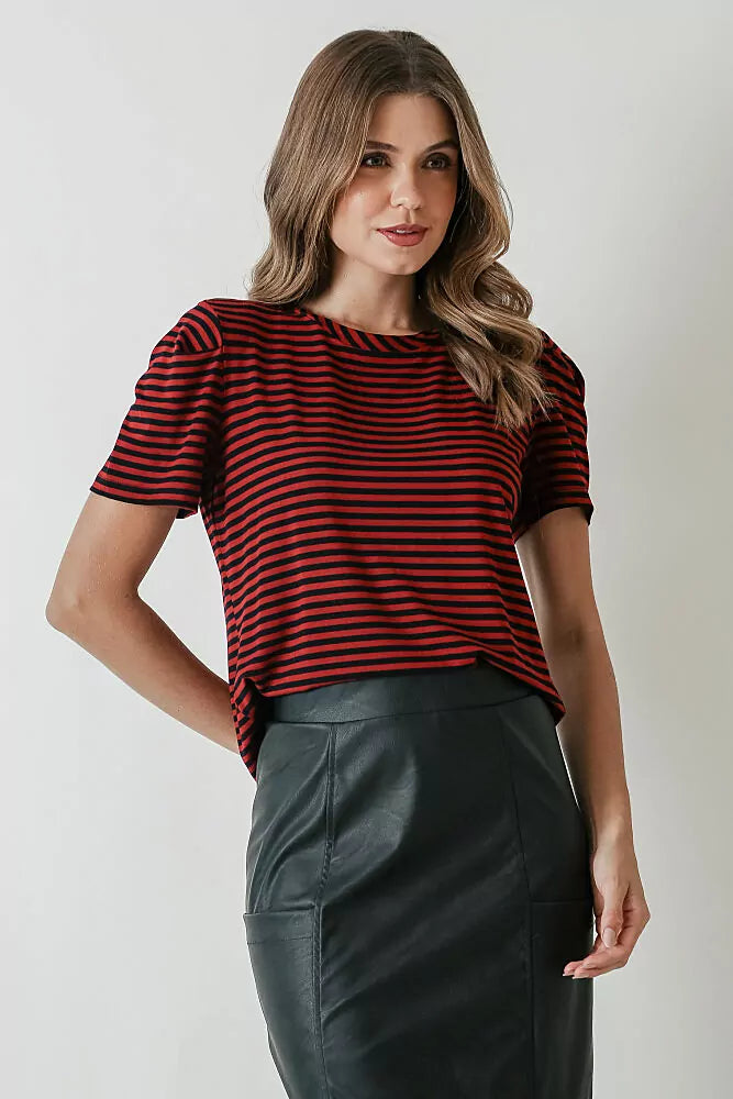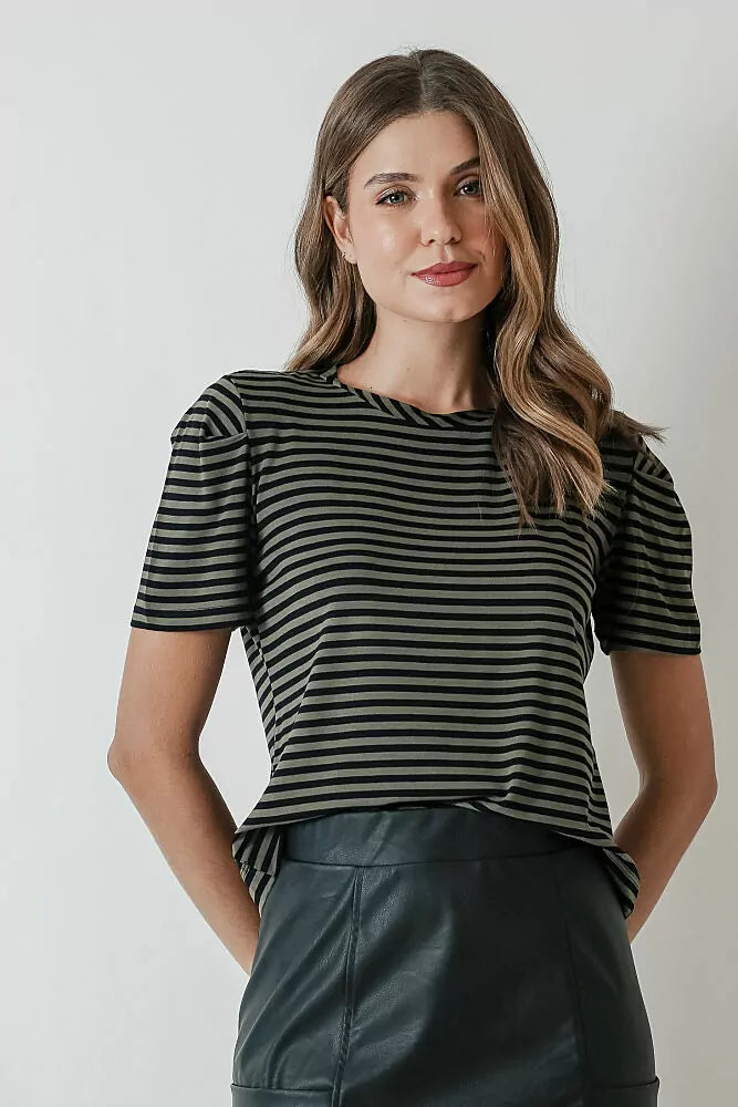 Blusa listrada com decote redondo no viés e pregas na manga.