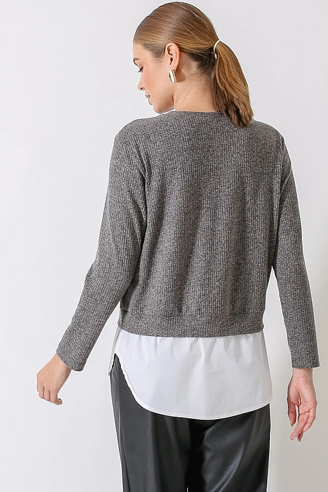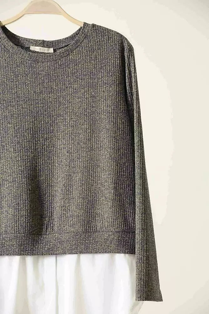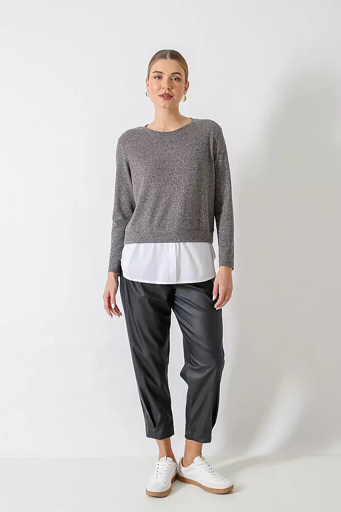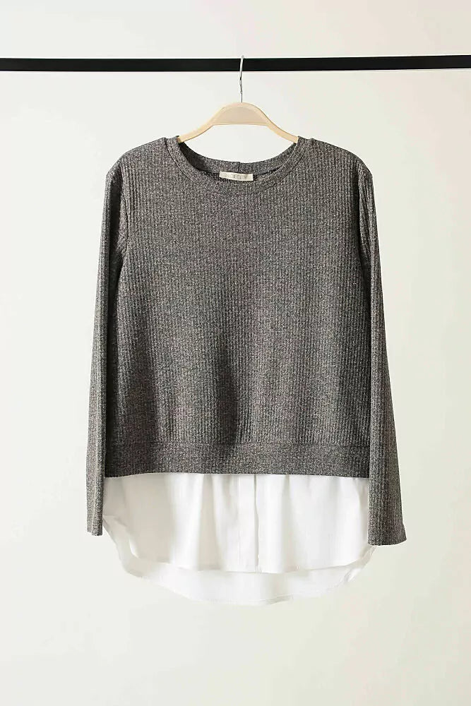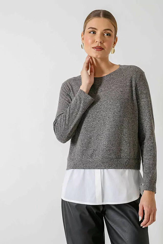 Blusa na malha tricot mescla de linho, manga longa, decote redondo e pala na barra em tricoline branca.