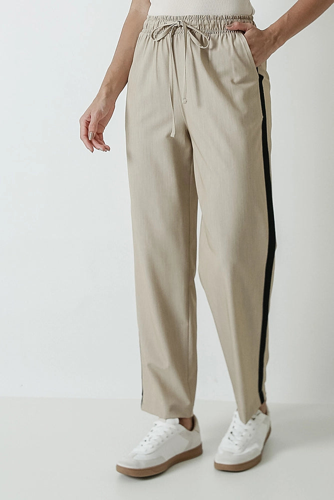Calça no tecido plano com cordão, bolsos e faixa nas laterais;