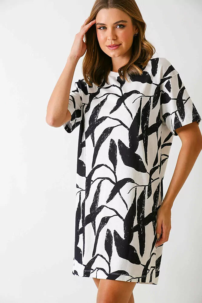 Vestido curto tipo T-Shirt na malha da algodão estampada, ombros deslocados, decote redondo em ribana.