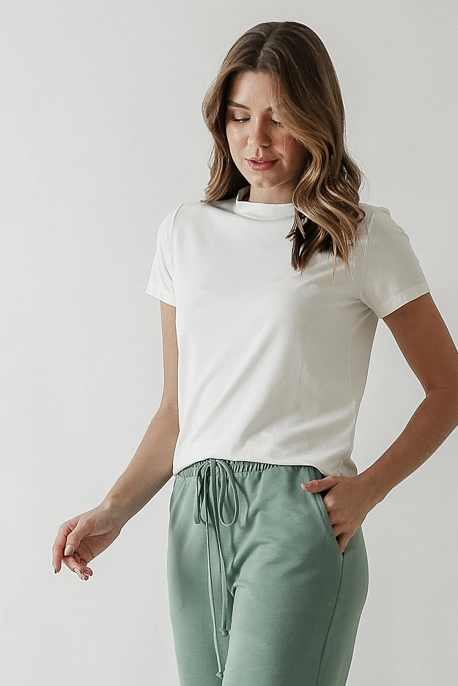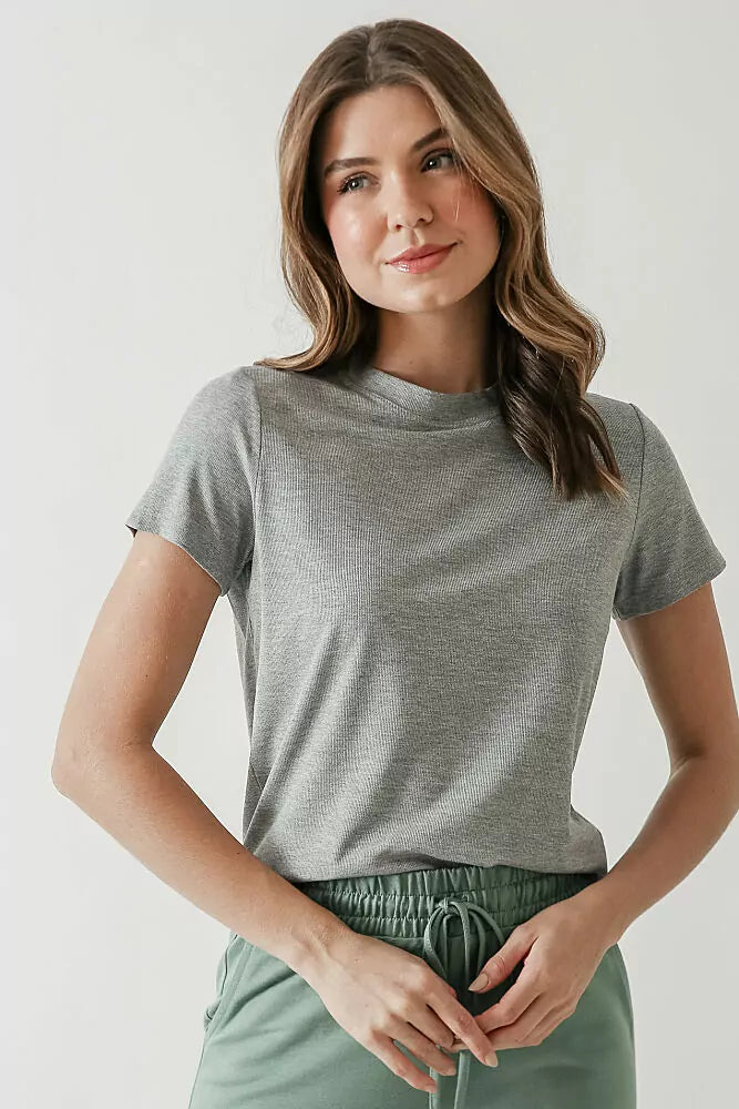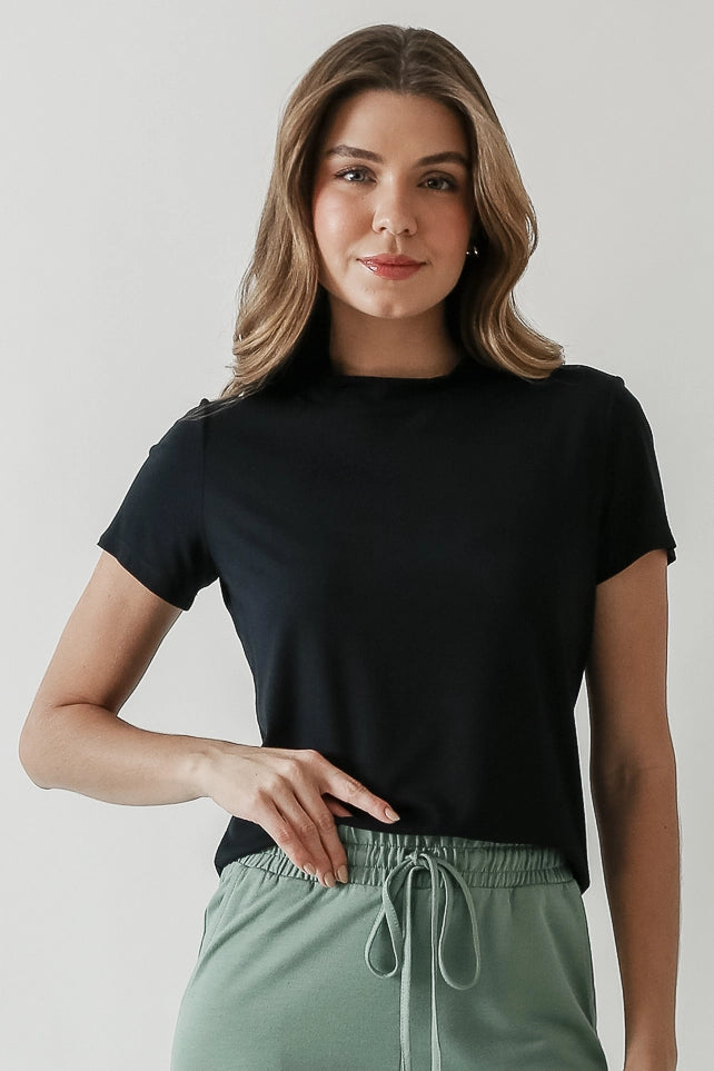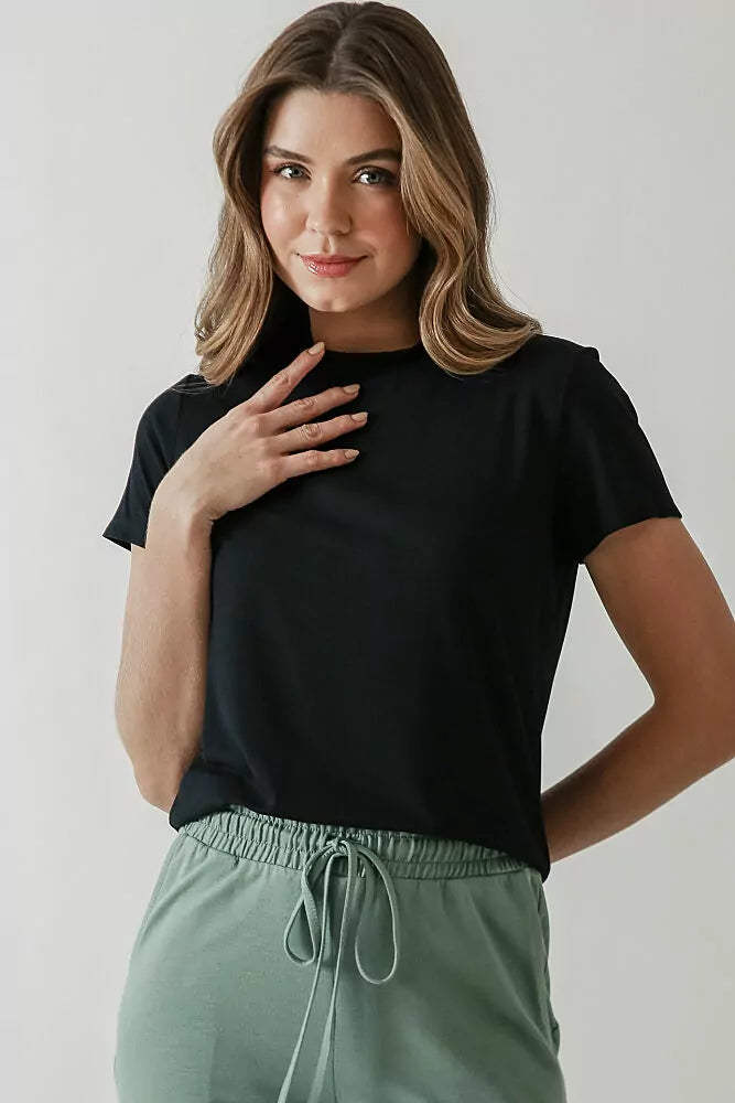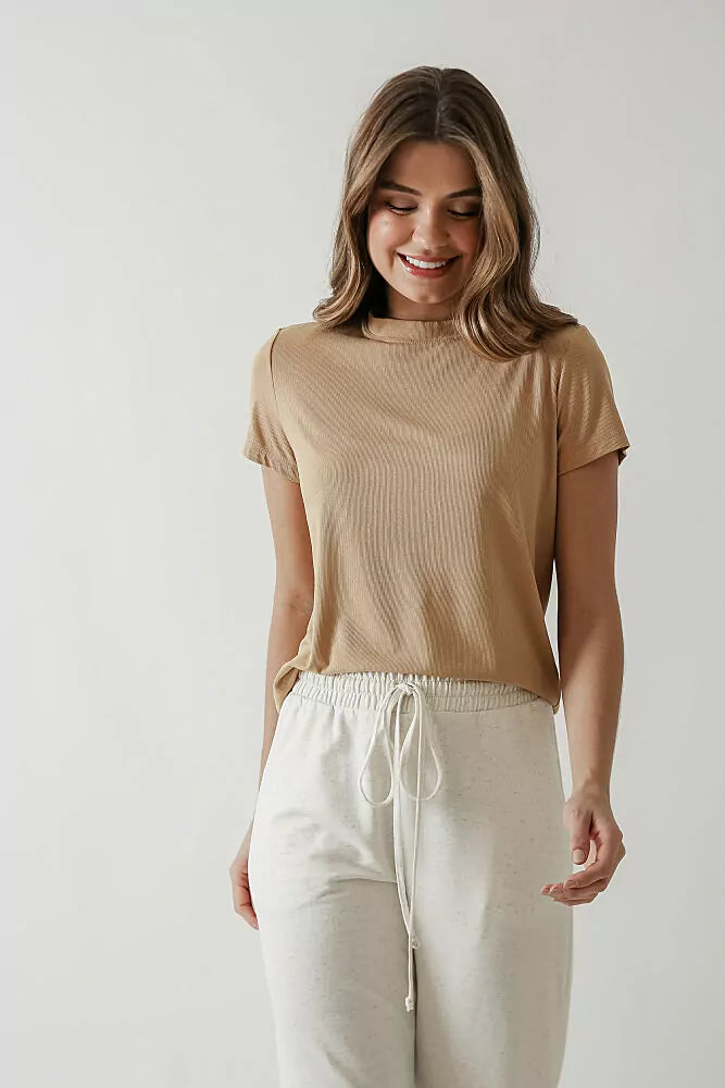 Blusa básica canelada com decote redondo com acabamento rebatido.