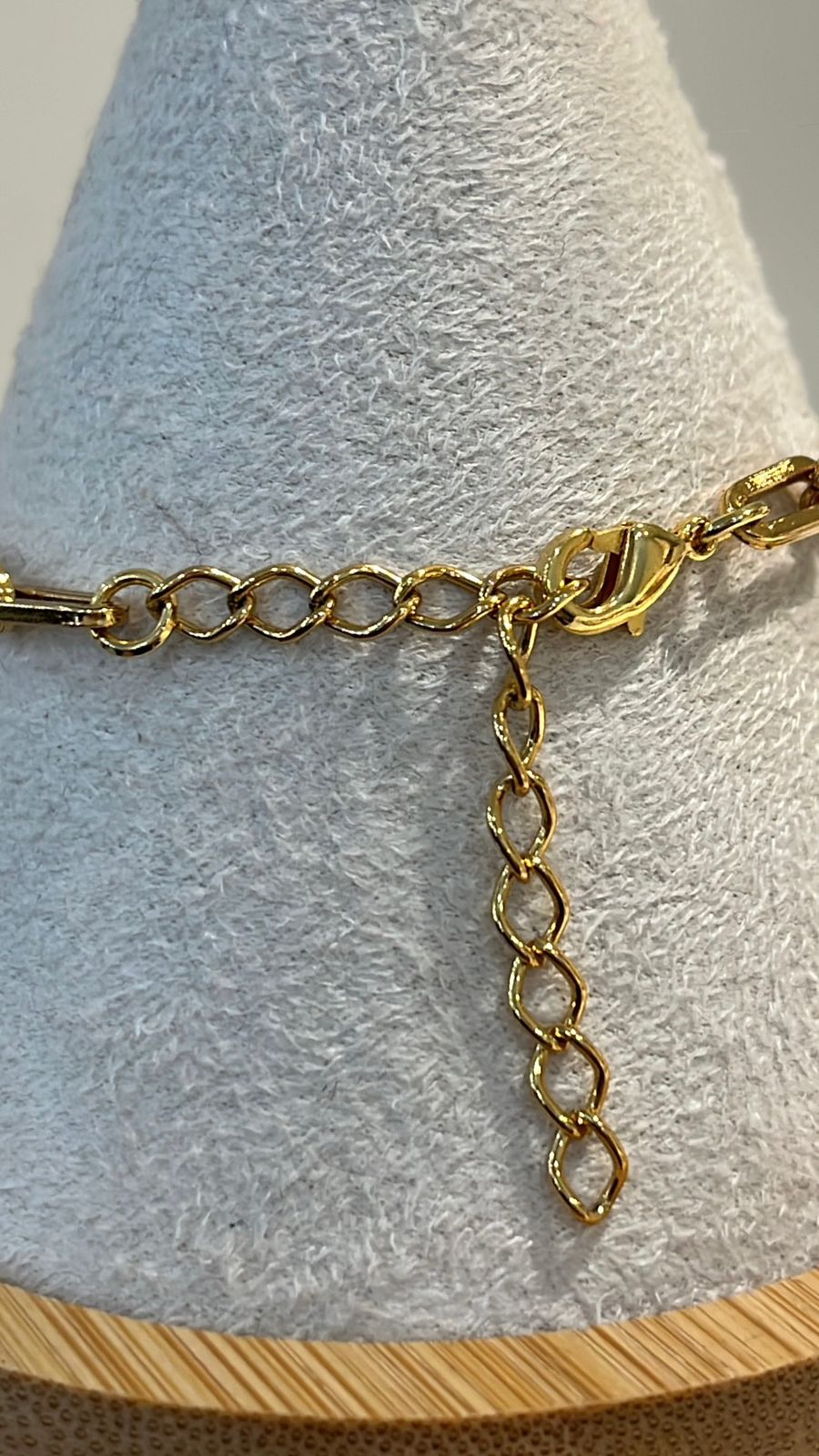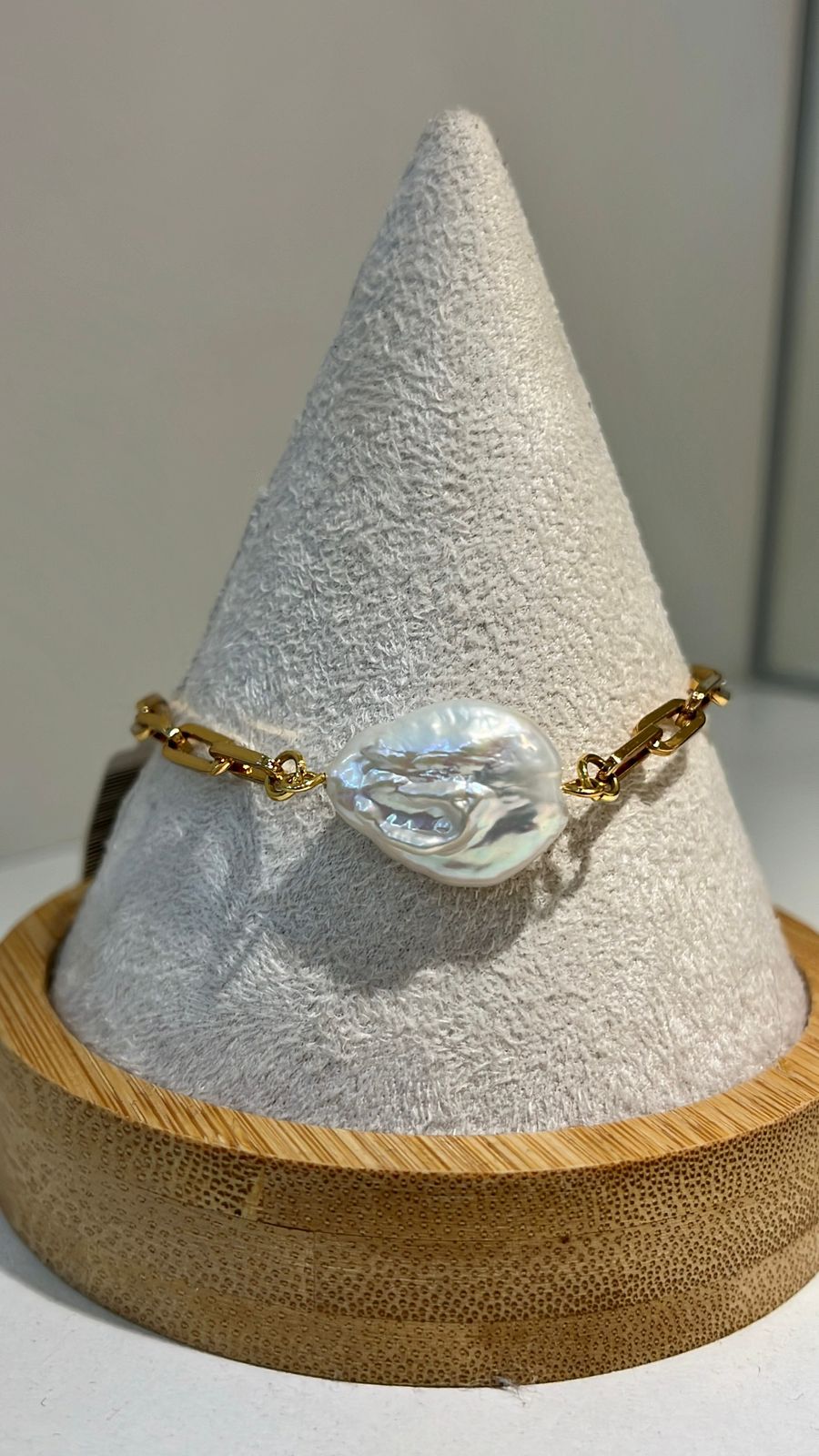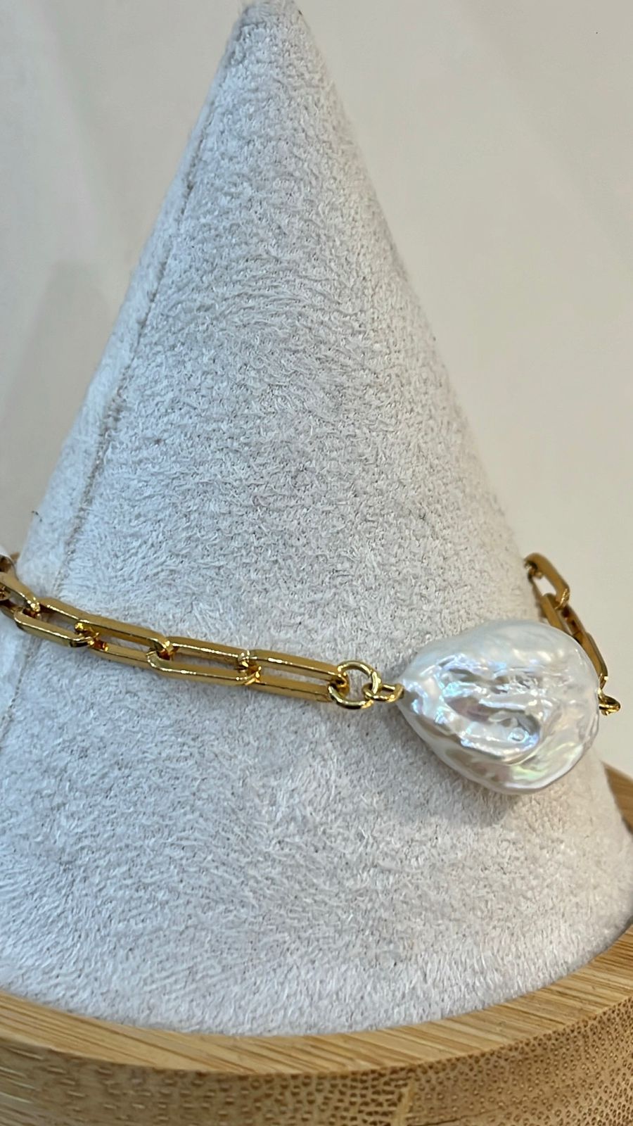 Detalhes: Pulseira na corrente de elos, com perola barroca