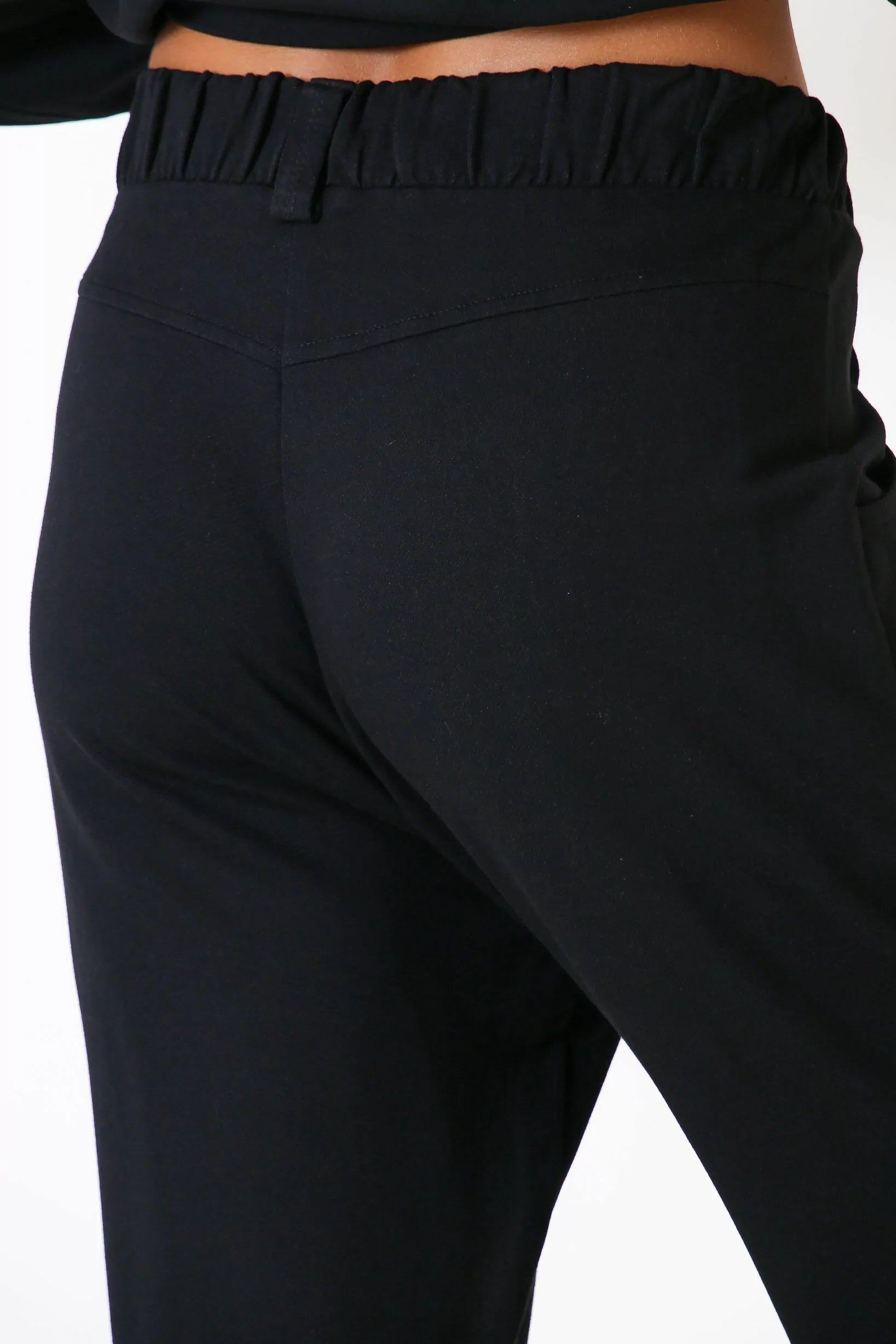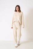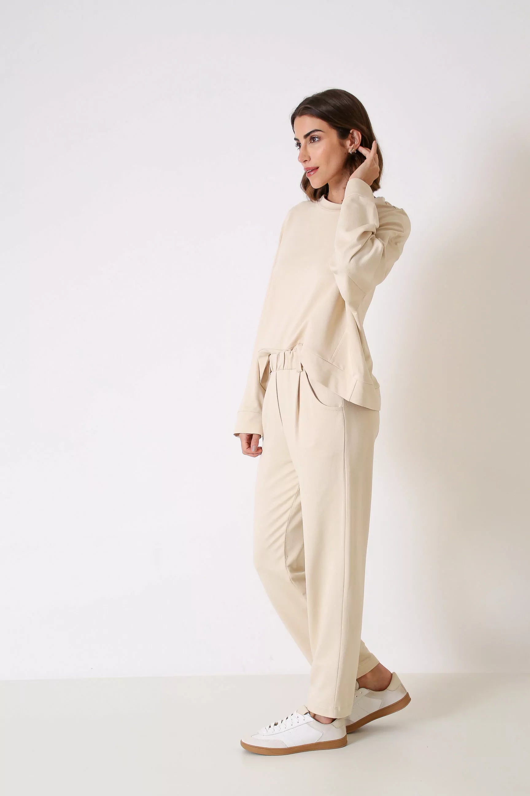 Conjunto moletinho, blusa com recortes, ombro deslocado e decote redondo, calça com pregas e bolsos laterais;