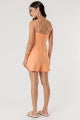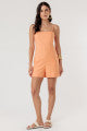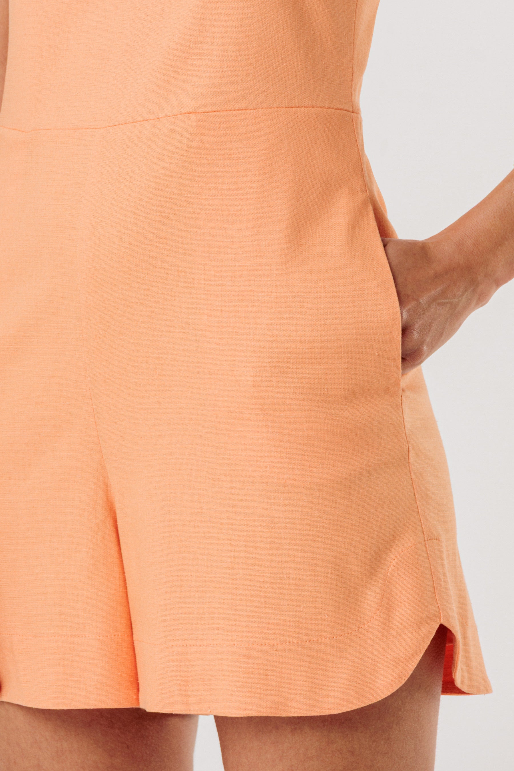 Macaquinho curto moletinho com bolsos laterais, decote quadrado e abertura nas laterais.