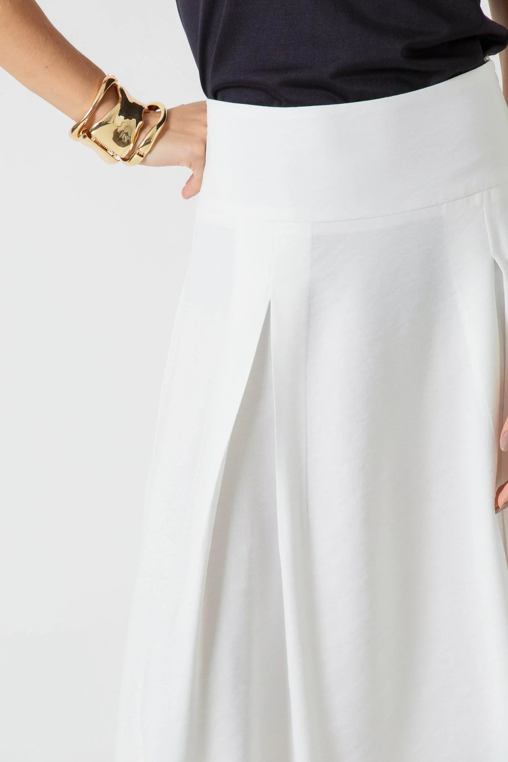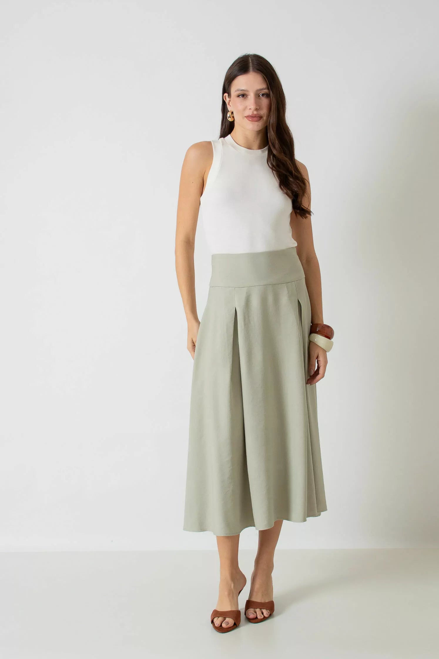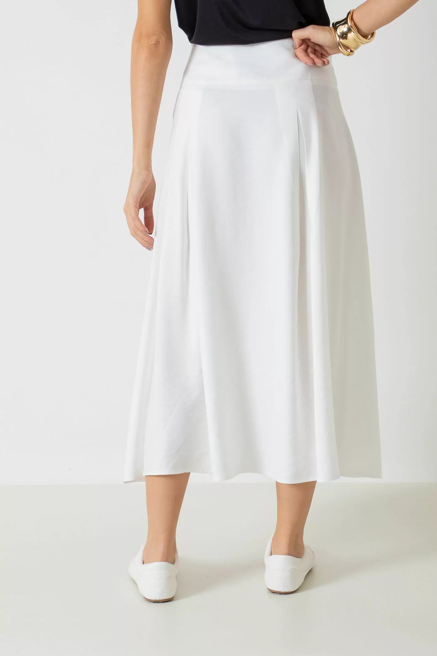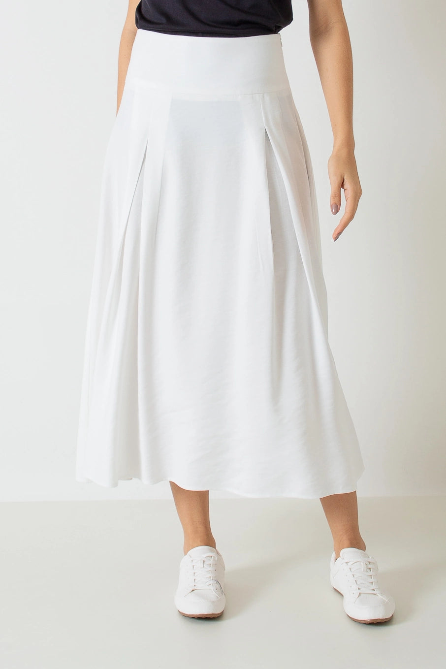Saia midi evasê com cós largo e pregas.